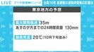 東京地方のあすの予想最高気温は10月下旬並みの20度と予想されていて、台風に向かって北よりの冷たい風が吹き込んでくる。きょうは29.2度まで上昇し、これは9月上旬並みで平年よりも暑かったが、あすは長袖の出番。雨や風が強く、気温も低いとなると、ずぶ濡れになってしまった場合は風邪をひいてしまう。さらに、あさってになると予想最高気温は30度で、今度は8月下旬並み。急に一日単位で10度近く下がって、また10度上がると体調を崩すことも考えられるので、注意してほしい。