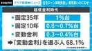コロナで経済が停滞する中、なぜ今控除率を下げるのか。背景にあるのは、長らく続いている「超低金利」だという。各社の動向を見ると、「固定35年」は1%台、「固定10年」は0.6~0.7%台、「変動金利」は0.3~0.4%。住宅金融支援機構の調べでは、変動金利を選んだ人は68.1%だった(2021年4月時点)。