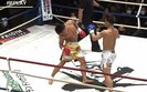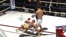 与座が放ったボディへのミドルに蓮實がカーフで応じると、蓮實のガラ空きの顔面めがけて左のハイを一閃。独特の軌道から咄嗟にミドルのガードを固めた蓮實は、弓のようにしなる変則的なハイを読み切れず、まともに顔面被弾。衝撃の反動で上半身が逆方向にぐにゃりと曲がった蓮實は、そのまま後頭部からマットに叩きつけられ失神KOを喫した。