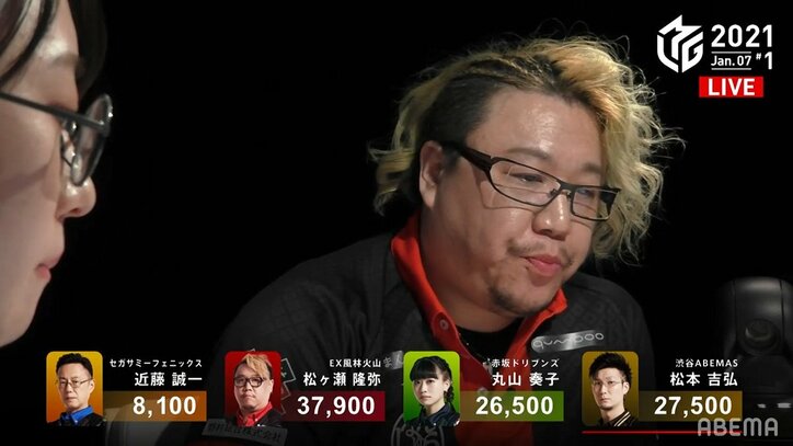 オーラスに火を吹くキャノン砲 松ヶ瀬隆弥、会心の逆転トップ「首位に返り咲きたい」/麻雀・Mリーグ Mリーグ 2022/01/08 09:32 拡大する ルーキーながら、ポイントゲッターとしての自覚は十分だ。プロ麻雀リーグ「大和証券Mリーグ2021」1月7日の第1試合、EX風林火山・松ヶ瀬隆弥(RMU)が昨年末から続く個人2連勝を挙げ、試合後は首位返り咲きへ強い意欲を見せた。【動画】松ヶ瀬隆弥の読みが見事に的中したアガリ この試合の対局者はセガサミーフェニックス・近藤誠一(最高位戦)、松ヶ瀬、赤坂ドリブンズ・丸山奏子(最高位戦)、渋谷ABEMAS・松本吉弘(協会)の並びで開始した。首位奪還は自らの仕事と言わんばかり、気合いに満ちた表情で入場した松ヶ瀬は、東1局からリーチで2600点の先制点を挙げる。その後、東場は配牌に恵まれるもリーチまではたどり着けず、守備とのバランスをギリギリまで保った粘りの展開が続く。 続きを読む