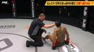 実力の差をまざまざと見せつけられたナタウットは、マットに腰を下ろしたまま動く素振りを全く見せない。レフェリーが駆け寄り、表情を覗きこみながらカウントを進めると、レフェリーをちらりと見て「無理無理…」といわんばかりに首を振った。