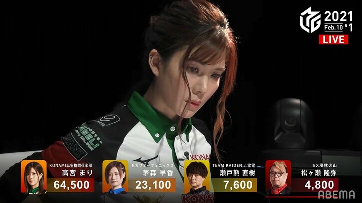 やっぱり手術は大成功!高宮まり「パワーA・ミートA」の大活躍で復帰後初トップ「楽しかった」/麻雀・Mリーグ Mリーグ 2022/02/11 09:39 拡大する 見違えるようにレベルアップした姿が、ファンを魅了した。プロ麻雀リーグ「大和証券Mリーグ2021」2月10日の第1試合、KONAMI麻雀格闘倶楽部・高宮まり(連盟)が7回のアガリを記録する大トップを獲得。急性虫垂炎の手術で戦列を離れていたが、復帰後の活躍が目覚ましい。【動画】高宮まりの天然ぶりがわかる「ほっこりインタビュー」 前節から続けて登板となる高宮、この試合は東家スタートで、南家以下はセガサミーフェニックス・茅森早香(最高位戦)、TEAM雷電・瀬戸熊直樹(連盟)、EX風林火山・松ヶ瀬隆弥(RMU)という並びで始まった。高宮は東1局、ドラの發を暗刻にしてテンパイすると、2軒リーチをかいくぐって茅森からロン。發・赤・ドラ3の1万2000点を手に入れた。 続きを読む