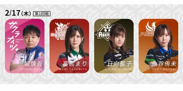 いよいよレギュラーシーズン終盤戦 リーグ3~6位の直接サバイバル対決/麻雀・Mリーグ Mリーグ 2022/02/17 15:36 拡大する Mリーグ機構は「大和証券Mリーグ2021」2月17日の第1試合に出場する4選手を発表した。レギュラーシーズンも残り14試合と終盤に入った中、この日の4チームはリーグ順位が3~6位の直接対決。セミファイナルシリーズ進出となる6位以内を死守するために、少しでも順位を上げておきたい。【中継】大和証券Mリーグ サクラナイツvs麻雀格闘倶楽部vsABEMASvsフェニックス 渋谷ABEMASはリーグ3位だが、一時トップに立ったところから2ランクダウンしたばかり。すぐに再び首位に戻れる程度のポイント差だが、逆にさらに減らすようだと、途端にボーダーラインの恐怖が近づいてくる。チームの癒やしキャラ・日向藍子(最高位戦)はマイナスポイントが2ケタまで減っただけに、チームのために、個人のために、ここでも1勝が欲しい。 続きを読む