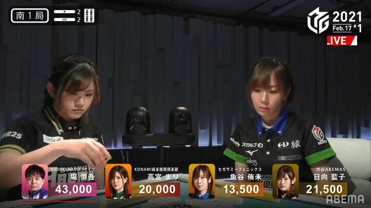 7枚残りのアガリ牌を引くのはどっちだ!女性雀士の超高確率バトルに解説も驚愕「聞いたことない!」/麻雀・Mリーグ Mリーグ 2022/02/18 10:04 拡大する 今にもアガリ牌が出てきそう。白熱のめくり合いに、見る者はまばたきすら許されなかった。プロ麻雀リーグ「大和証券Mリーグ2021」2月17日の第1試合、渋谷ABEMAS・日向藍子(最高位戦)とセガサミーフェニックス・魚谷侑未(連盟)が超高確率のめくり合いを展開、その白熱振りに解説・土田浩翔(最高位戦)は驚愕し、また実況の日吉辰哉(連盟)も大いに熱を込め、この戦いを伝えた。【動画】7枚待ちを引き合う2人 続きを読む