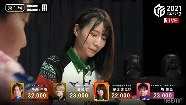 今じゃなーい!伊達朱里紗、リーチ後にドラ3枚引き思わずニヤリ 熱血実況「何よこのツモ、おかしいじゃない!?」/麻雀・Mリーグ Mリーグ 2022/02/18 10:06 拡大する リーチ後だからしょうがない、もう笑うしかない?プロ麻雀リーグ「大和証券Mリーグ2021」2月17日の第2試合にて、KONAMI麻雀格闘倶楽部・伊達朱里紗(連盟)がリーチをかけたところ、その後にアガリ牌ではないドラを3枚続けて引き、思わず笑ってしまうシーンが生まれた。【動画】リーチ後のドラの連続に思わず笑う伊達朱里紗 状況は東1局1本場、11巡目に先制リーチをかけた伊達。ドラ4索と7索の受けに安目の7索を引いてのテンパイだが、赤が2枚あり納得のリーチだ。一発目のツモはドラ。これをクールにツモ切ると、さらに次のツモも同じくドラだ。ここでも伊達は眉一つ動かさないが、3度目のドラを引くとやや目には驚きの色が。次ツモをツモ切る際には口元に笑みがはっきりと見てとれた。実況の日吉辰哉(連盟)も「こんなことあっていいんですか!?リーチ後にドラ3枚ですよ!」と絶叫。さらに日吉は「何よこのツモ、おかしいじゃない!?」と伊達の心の内を代弁した。 続きを読む