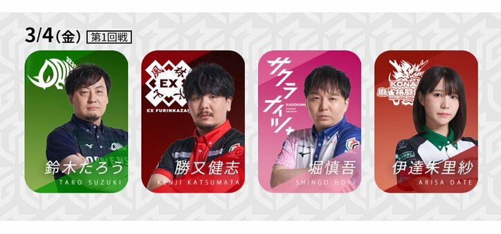 赤坂ドリブンズ、奇跡の連勝はあるのか レギュラーシーズン残りはわずか6試合/麻雀・Mリーグ Mリーグ 2022/03/04 16:22 拡大する Mリーグ機構は「大和証券Mリーグ2021-22」3月4日の第1試合に出場する4選手を発表した。残りわずかとなったレギュラーシーズンだが、この大詰めでリーグ6位のKADOKAWAサクラナイツ、とリーグ7位の赤坂ドリブンズが直接対決。408.6ポイント差がついている中、大波乱や奇跡が起きる夜になるのか。【中継】大和証券 Mリーグ ドリブンズvs風林火山vsサクラナイツvs麻雀格闘倶楽部 レギュラーシーズンは上位6位までがセミファイナルシリーズ進出。また上位4チームまでが、セミファイナルの最終日を戦う権利を得られるということもあり、どのチームも最終盤まで気を抜くことなく、少しでもポイントを多く、順位を上にしようと戦っている。ただ、やはりレギュラーシーズンを抜けられるかどうかが、天と地の差。残り6戦で約400ポイントはセーフティーリードとも思えるが、仮にKADOKAWAサクラナイツが連続ラス、赤坂ドリブンズが連続トップで、200ポイントほど詰めようものなら、途端に残り4戦の状況も変わってくる。KADOKAWAサクラナイツ・堀慎吾(協会)は最悪でも3着以内、さらには赤坂ドリブンズ・鈴木たろう(最高位戦)より下の着順を取らないことを目指す。逆に鈴木は、序盤からトップを目指しつつ、リードしていればあらゆる手をつくしても、堀の順位を下げようとすることもあるだろう。 続きを読む