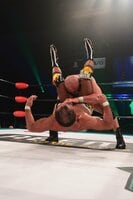 ならばとすかさずスライディングDにいくが、これを藤田が喉輪でキャッチし、そのままチョークスラムでマットに叩きつける。そして田中のお株を奪うスライディングDを叩き込むと、コーナーに上がり野獣のスーパーフライか!? と思われたが、これは田中がいち早く立ち上がり、リングが壊れんばかりの強烈な雪崩式ブレーンバスター。