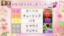 「花には幸せホルモンを分泌させる効果があります。なので(生活環境に)花を置いた方が絶対に良いです。赤い花は向上心・意欲・気力・勇気を与えてくれます。ピンクは緊張感を解してくれます。黄色は対人関係の緩和。白は心身のリフレッシュ。青は感情の高ぶりを抑制。オレンジは体内機能の活性化。紫は鎮静作用に効果があります」(ナスD)