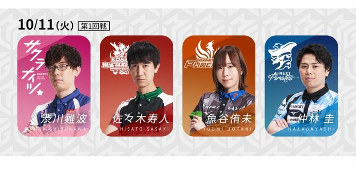 ルーキー同士の直接対決 Mリーグ初勝利を手にするのは渋川か!?仲林か!?/麻雀・Mリーグ Mリーグ 2022/10/11 15:05 拡大する Mリーグ機構は「大和証券Mリーグ2022-23」10月11日の第1試合に出場する4選手を発表した。注目は今期からMリーグに参戦した2選手による初勝利争奪戦。初の勝利者インタビューを受けることができるか。【中継】Mリーグ サクラナイツvs麻雀格闘倶楽部vsフェニックスvsPirates 今期からMリーグに参戦したのは3選手。そのうち昨期まで公式解説を務めていたことで注目されていたのがKADOKAWAサクラナイツ・渋川難波(協会)だ。デビュー戦は上々の2着で終え初の試合後インタビューを経験、落ち着いた打ち回しの評価も上々だった。自身2戦目で、勝利のポーズと合わせた笑顔を見せたいところだ。 続きを読む