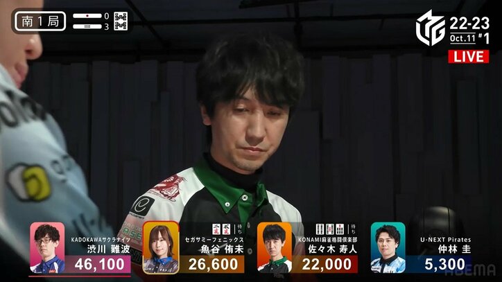 全てが速くて全員パニック!佐々木寿人の鳴き、アガリ、点数申告が猛スピード「あっという間」「何もかもが速すぎる」/麻雀・Mリーグ Mリーグ 2022/10/26 17:52 拡大する 電光石火の高打点は、点数申告までもが速かった。KONAMI麻雀格闘倶楽部(連盟)の佐々木寿人が、その素早い一連の動きで、解説者やスタッフ、ファンを驚愕させた。【映像】何もかもが速い佐々木寿人のアガリ プロ麻雀リーグ「大和証券Mリーグ2022-23」10月11日の第1試合は、起家からKADOKAWAサクラナイツの渋川難波(協会)、セガサミーフェニックスの魚谷侑未(連盟)、佐々木、U-NEXT Piratesの仲林圭(協会)の並びで始まった。真骨頂を発揮したのは、南1局3本場。持ち点2万2000点の3着目で迎えた佐々木は、ソウズの染め手に着手した。上家の魚谷から5巡目にペンチャンの7索、8巡目にカンチャンの2索を鳴くと、4・7索、5索の変則三面待ちでテンパイ。その刹那、下家の仲林から7索が零れ落ち、清一色・ドラの跳満・1万2000点(+900点、供託1000点)を獲得した。 続きを読む