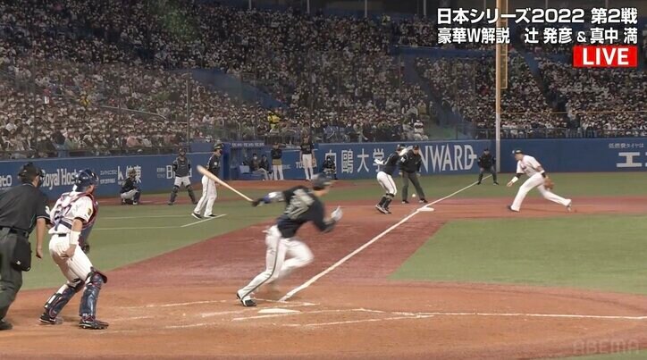 連夜の“神宮三塁線劇場”フェアかファウルかぎりぎりの打球に球場ざわめく「ベース上じゃね」「昨日と似てるw」 2022/10/23 20:18 拡大する 【日本シリーズ】ヤクルト-オリックス(10月23日/神宮球場) 10月23日に行われた「SMBC日本シリーズ2022」第2戦、5回にオリックスの中川圭太が放った三塁線ぎりぎりの打球に球場がざわめき、ABEMAの視聴者からも「ベース上じゃね」「昨日と似てるw」と多数の反響が寄せられた。【映像】三塁べースをかすめるように飛んだ打球 2-0とオリックス2点リードの5回、2死三塁のチャンスで打席に中川。ヤクルト2番手投手の大西広樹が投じた4球目を力強く引っ張ると、打球は三塁線へ。フェアであればタイムリーという当たりだったものの、審判の判定はファウルに。球場は連夜の際どい当たりに騒然となり、リプレイ映像が流されるとまたもざわめきが起こった。 続きを読む
