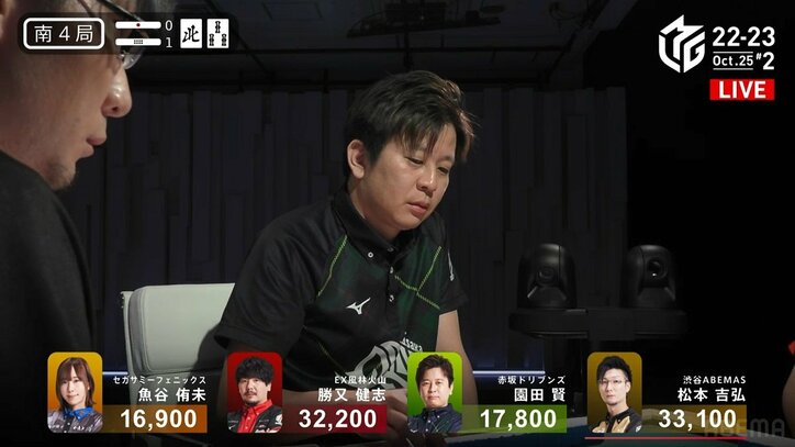 カンした牌が全部ドラに化ける“事故”発生 対戦者の「なんなん?」な顔に笑いと同情集まる「わろた」「かわいそうすぎる」/麻雀・Mリーグ Mリーグ 2022/10/26 17:49 拡大する 麻雀は予期せぬ事態が起こり得る競技。だからこそ面白いとも言えるが、プロ麻雀リーグ「大和証券Mリーグ2022-23」10月25日の第2試合で発生した事象は、他の者からすれば、あまりにも理不尽だった。【映像】カンドラが“モロ乗り”した瞬間を見つめる園田賢 当試合ではセガサミーフェニックス・魚谷侑未(連盟)、EX風林火山・勝又健志(連盟)、赤坂ドリブンズ・園田賢(最高位戦)、渋谷ABEMAS・松本吉弘(協会)の4選手が牌を交えた。問題の場面は南4局1本場。トップ目は南1局で魚谷から9600点(供託2000点)を奪取した親の松本で、その魚谷は2着目からラス目へ転落していた。松本との点差は1万6200点で、3着目の園田とはわずか900点の差。第1試合でチームメイトの茅森早香(最高位戦)が4着に沈んでいただけに、狙うは逆転トップ、最低でも3着は確保したい魚谷は、ここで勝負に出る。配牌時点で暗刻だった3索を第1ツモで引き寄せると、その数巡後に打点を上げるべく暗カン。その後、新ドラが映し出されると、なんと、その表示牌は2索、即ち魚谷が暗カンした3索だったのである。 続きを読む