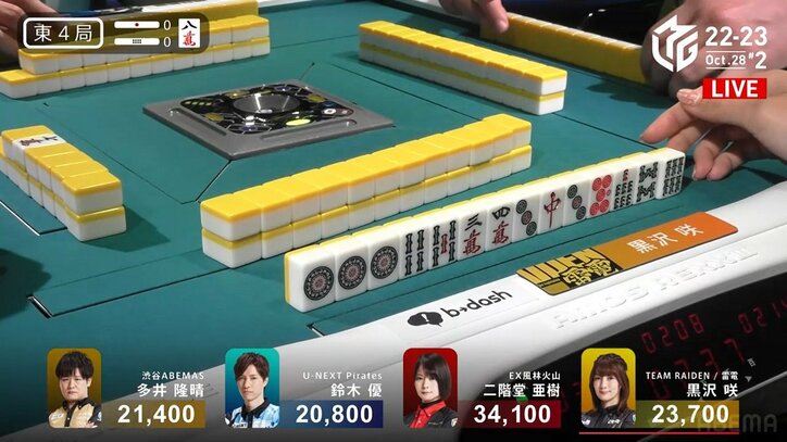 レジェンド雀士も「初めてみました」とびっくり 4人中3人が1巡目でイーシャンテン トップ雀士の豪運が生んだ奇跡/麻雀・Mリーグ Mリーグ 2022/10/29 07:40 拡大する 誰が最初にテンパイする?プロ麻雀リーグ「大和証券Mリーグ2022-23」10月28日の第2試合において、対局者4人のうち3人が1巡目にイーシャンテンとなる珍事。これにレジェンド雀士が「初めてみました」と驚き、視聴者からも大きな反響があった。【映像】開局早々、3人がイーシャンテンの激レアシーン 東4局、東家のTEAM雷電・黒沢咲(連盟)が第1ツモでイーシャンテン。「4・5・7・8」のソウズに6索を引く嬉しい入り方で、今にもテンパイしそうな手牌に期待が高まる。続く南家の多井は9筒と3筒のくっつきとなるイーシャンテン。西家のU-NEXT Pirates・鈴木優(最高位戦)は第1ツモで5つ目の対子ができて、七対子テンパイへあと一歩と、3人がイーシャンテンとなっていた。 続きを読む