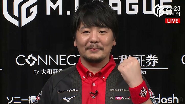女性には優しい押しが効果てきめん?勝又健志、新技「ふんわりプッシュ」で今期2勝目/麻雀・Mリーグ Mリーグ 2022/11/09 09:20 拡大する 3人の人気女性雀士に囲まれた状況下で、軍師が新技を披露した。プロ麻雀リーグ「大和証券Mリーグ2022-23」11月8日の第1試合では、EX風林火山の勝又健志(連盟)が安定感抜群の闘牌で、今期2勝目を飾った。【映像】勝利を決定づける勝又健志の親跳満 当試合は起家からKONAMI麻雀格闘倶楽部の高宮まり(連盟)、渋谷ABEMASの日向藍子(最高位戦)、セガサミーフェニックスの魚谷侑未(連盟)、勝又の並びでスタート。序盤はこの日が誕生日だった高宮をはじめとする女性3選手が積極的に動き、勝又は鳴りを潜めていた。反撃の狼煙を上げたのは、東3局3本場だ。フリテンながらもヤミテンに構えると、魚谷のリーチにも臆せずに槓子となった3筒を暗カン。新ドラをめくると表示牌が2筒、即ちドラが一気に4つの絶好手に変化し、その後にツモって見事にツモ・ドラ4の満貫を・8000点(+900点、供託1000点)を成就させた。続く親番の東4局でも、ドラを駆使してリーチ・一発・ツモ・一盃口・ドラ3の跳満・1万8000点(供託1000点)を完成。一気にトップ目へと躍り出た一方で、この日、随所で見せたのが絶妙な選択だった。 続きを読む