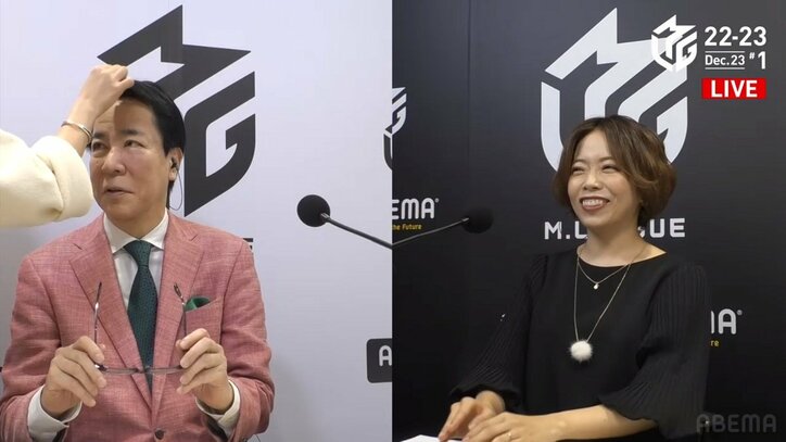 今、お直し中でした!レジェンド解説者、メイク中が映り込むハプニングに実況・視聴者が大爆笑「いい放送事故だったw」/麻雀・Mリーグ Mリーグ 2022/12/24 07:26 拡大する あら失礼!少々お待ちください。プロ麻雀リーグ「大和証券Mリーグ2022-23」12月23日の第1試合の終了後、選手の勝利者インタビューから放送席へ画面が切り替わる際、解説者が髪型を直している最中が映り込み、実況が大笑い、視聴者も「くっそ面白いw」「メイクさん初登場ww」と爆笑が起こる一幕があった。【映像】メイク中が映り込むハプニング 第1試合のトップはKONAMI麻雀格闘倶楽部・高宮まり(連盟)。インタビューが終了し、放送席へ画面が切り替わると、そこにはメガネを取り、スタイリストに髪型を直してもらっている土田浩翔(最高位戦)の姿が。これを見た実況の小林未沙は、思わず顔を手で覆って大笑い。「これはちょっと放送初のハプニングでございますけれども、はい土田さん、戻って参りました!」と状況を伝えた。土田は「え、もう戻ったの?ああそうですか!」とびっくり。 続きを読む