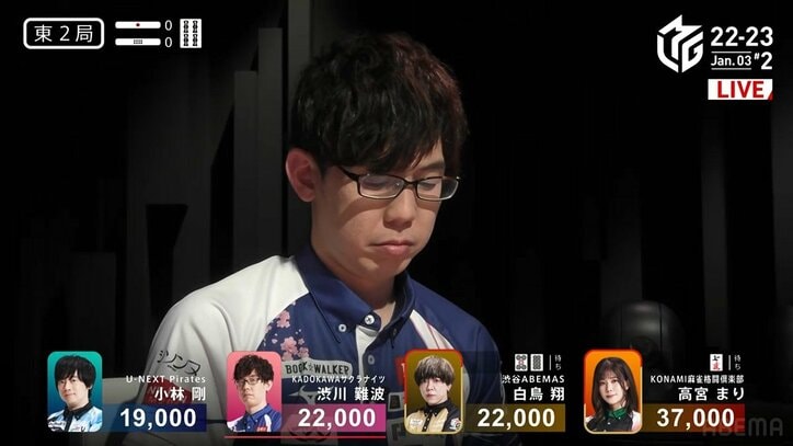 あ、やっちゃいましたか?渋川難波、勢いよくリーチが一発放銃で呆然の顔がアップに「ナイスリアクション」/麻雀・Mリーグ Mリーグ 2023/01/04 09:57 拡大する 真剣勝負の中で、時折、選手が見せる素の表情。プロ麻雀リーグ「大和証券Mリーグ2022-23」1月3日の第2試合でも、そんな表情にファンが大ウケする一幕があった。【映像】まさかの放銃にぽかーん 主演はMリーガー1年目のKADOKAWAサクラナイツ・渋川難波(協会)だ。場面は自身が親の東2局、南家の渋谷ABEMAS・白鳥翔(連盟)が5巡目でリーチをかけると、西家のKONAMI麻雀格闘倶楽部・高宮まり(連盟)も8巡目で応戦。早い仕掛けを受けながらも順調に手を進める渋川は、その直後に高目で一盃口が付く変則三面張でテンパイさせた。「うわっ、追い付いた」。解説の石橋伸洋(最高位戦)が絶叫するも、ここで渋川が手に取った牌は高宮の当たり牌である七万。河に捨てた刹那、無情にも「ロン」が宣言されると、一発放銃の渋川は開いた口が塞がらず、ただただ呆然と卓を見つめ続けた。 続きを読む
