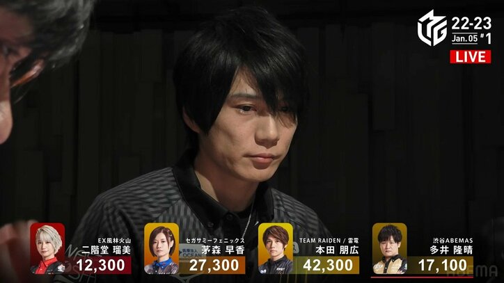 HONDAのエンジン、さらに加速!本田朋広、個人最多9勝目&ポイント首位「ファイナル目指して頑張る」/麻雀・Mリーグ Mリーグ 2023/01/06 09:01 拡大する 今年もMリーグの世界に「HONDA」の名前が轟く。プロ麻雀リーグ「大和証券Mリーグ2022-23」1月5日の第1試合は目下個人首位で絶好調のTEAM雷電・本田朋広(連盟)がトップ。中盤に劣勢を跳ね返す跳満が飛び出すと、南3局にはトップを快走するセガサミーフェニックス・茅森早香(最高位戦)から直撃の親跳満をアガり、今期9勝目を掴み取った。【映像】本田朋広、会心の逆転・親跳満シーン この試合は東家からEX風林火山・二階堂瑠美(連盟)、茅森、本田、渋谷ABEMAS・多井隆晴(RMU)の並びで開始した。本田は東1局に5200点を放銃、その後も失点が続き、一時は多井と共にラス目へ落ちた。しかし今期の本田は積まれているエンジンが違う。東4局に東・赤2・ドラ3の跳満、1万2000点をアガって挽回すると、南3局はリーチ・七対子・赤・裏ドラ2の1万8000点をトップ目の茅森からロン、これで一気に逆転だ。 続きを読む