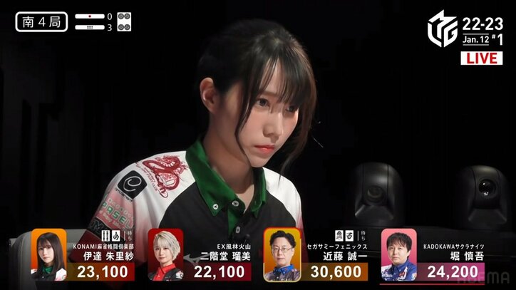 今期屈指の神回誕生!好プレー連発の名勝負、結末は伊達朱里紗の逆転トップ「一番うれしいかもしれない」/麻雀・Mリーグ Mリーグ 2023/01/13 11:24 拡大する ド派手なアガリに神がかり的な“ビタ止め”の連発。今期屈指の神回と誰もが感じる試合が生まれた。プロ麻雀リーグ「大和証券Mリーグ2022-23」1月12日の第1試合は大きくスコアが動く展開を経て、KONAMI麻雀格闘倶楽部・伊達朱里紗(連盟)がトップを獲得。一時は1人大きく離されたラス目に落とされながら、持ち前のリーチ攻勢と諦めない仕掛けによって「今までで一番うれしいかもしれない」と喜ぶ結果を掴み取った。 続きを読む