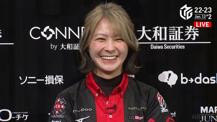 リーチ総回数18回の超乱打戦 弾幕抜けた二階堂亜樹が競り勝ち 勝利の山ポーズは照れまくり/麻雀・Mリーグ Mリーグ 2023/01/13 11:41 拡大する 姉の仇をすぐに討つ。プロ麻雀リーグ「大和証券Mリーグ2022-23」1月12日の第2試合はEX風林火山・二階堂亜樹(連盟)がトップ。第1試合で大接戦の末に敗れた姉・二階堂瑠美(連盟)の失点を取り戻し、余りある勝利。試合後はファンと約束をしたポーズも披露した。【映像】照れながら「山ポーズ」をする二階堂亜樹 試合は起家から亜樹、KADOKAWAサクラナイツ・内川幸太郎(連盟)、KONAMI麻雀格闘倶楽部・佐々木寿人(連盟)、セガサミーフェニックス・茅森早香(最高位戦)の並びで開局した。亜樹は東1局に3900点のツモアガリを決めると、1本場には好配牌を活かして7巡目に2・5筒待ちでリーチ。これを一発でツモ、しかも赤5筒でアガり、リーチ・一発・ツモ・タンヤオ・平和・赤・裏ドラの1万8000点を獲得、ダントツ状態となった。その後も続けてアガリをモノにして、4局連続の加点でスコアは6万点オーバーだ。 続きを読む