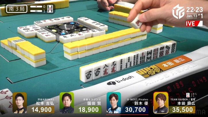 それ、アガってるって!イケメン雀士がツモアガリ牌をあわやリリース 解説も大慌て「おおお!」/麻雀・Mリーグ Mリーグ 2023/01/14 08:34 拡大する ついうっかりでは済まされないミスを、すんでのところで回避した。プロ麻雀リーグ「大和証券Mリーグ2022-23」1月13日の第1試合。TEAM雷電・本田朋広(連盟)がアガリをツモった際、やや間が空いたことに解説が大慌て、視聴者も大きな反響を寄せる一幕があった。【映像】せっかくのアガリ牌を切りそうになった瞬間 場面は南3局1本場、トップ目の本田がペン七万の待ちでリーチ。これを終盤にツモったものの、ツモ発声をせず河へリリースしそうになるハプニングが発生した。これに解説の石橋伸洋(最高位戦)は「おおお!」と大慌て、実況の松嶋桃(協会)も「ちょっとなんか…間がありましたね」と驚きの声を上げた。 続きを読む