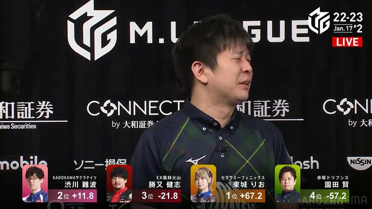 「6000オール2回はダメです!」園田賢、お手上げラスにボヤキ全開 ファンも相手も大笑い「怒りと悲しみのダメ出し」/麻雀・Mリーグ Mリーグ 2023/01/18 10:01 拡大する 時として不条理な競技。それが麻雀だと理解していながらも、ボヤかずにはいられなかったようだ。1月17日、プロ麻雀リーグ「大和証券Mリーグ2022-23」第2試合では、赤坂ドリブンズの園田賢(最高位戦)が4着と撃沈。試合後のインタビューでファンや対局者を爆笑させた。【映像】ボヤキ節が止まらない園田賢 起家からKADOKAWAサクラナイツ・渋川難波(協会)、EX風林火山・勝又健志(連盟)、セガサミーフェニックス・東城りお(連盟)、園田の並びで始まった当試合は、序盤に東城が大爆発した。親番の東3局で2連続の親跳満。一気に持ち点を5万点以上とし、そのまま逃げ切りを決めた。これについて園田は、「もう悲しくて仕方ない。麻雀の不条理を感じましたね」と恨み節。1回目の親跳満をツモられた際には「まだここから頑張ればトップを取れるかもな」と思っていたそうだが、「6000(点)オール2回はダメですから!まくれませんから」と完全に心が折れたことを告げ、袖で勝利者インタビューを待つ東城を大笑いさせた。 続きを読む