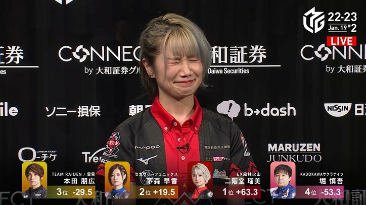 アガって振ってのドタバタ劇 二階堂瑠美、大量放銃も逃げ切りトップ「元気よすぎたかな」/麻雀・Mリーグ Mリーグ 2023/01/20 07:26 拡大する 牌の流れに身をまかせ、自然に打つ。そう貫いたからこそ、勝運が引き寄せられた。プロ麻雀リーグ「大和証券Mリーグ2022-23」1月19日の第2試合はEX風林火山・二階堂瑠美(連盟)がトップ。満貫、倍満と大きな失点があったものの、終わってみれば4万点超の快勝だ。チームの同日2連勝に貢献したものの、試合後は「元気よすぎたかな」と反省の弁を口にした。【映像】二階堂瑠美、芸術的な三色同順一発ツモのシーン 試合は起家からTEAM雷電・本田朋広(連盟)、セガサミーフェニックス・茅森早香(最高位戦)、瑠美、KADOKAWAサクラナイツ・堀慎吾(協会)の並びで開始した。瑠美は東2局2本場、ダマテンで堀から満貫をゲット。これで勢いに乗ると、東3局は早いカン4索テンパイをダマテンに構え、リャンメンへ変化してリーチ。4・7索待ちで高目の4索なら三色同順だ。これを瑠美は見事に4索を一発で引き当て、リーチ・一発・ツモ・三色・ドラの1万8000点を獲得した。 続きを読む