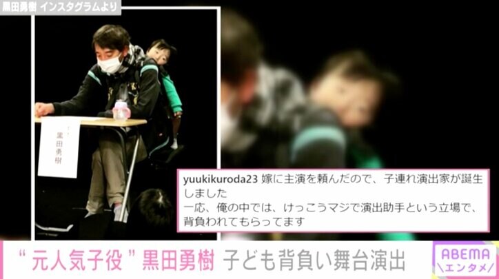 元人気子役・黒田勇樹、子どもを背負いながら仕事する姿を公開「俺の中ではけっこうマジで演出助手」 ABEMAエンタメ 2023/01/26 11:41 拡大する 子役として活躍し、現在は舞台演出家としても活動している俳優の黒田勇樹(40)が24日、自身のInstagramを更新。子どもを背負いながら仕事をしている姿を公開した。【映像】黒田勇樹、妻と息子との家族ショット 1988年にNHK大河ドラマ『武田信玄』で俳優デビューし、その2年後、8歳でミュージカル『オリバー!』の主演に抜擢された黒田。1994年に放送されたTBS系のドラマ『人間・失格~たとえばぼくが死んだら』など様々な作品に出演していた。 続きを読む