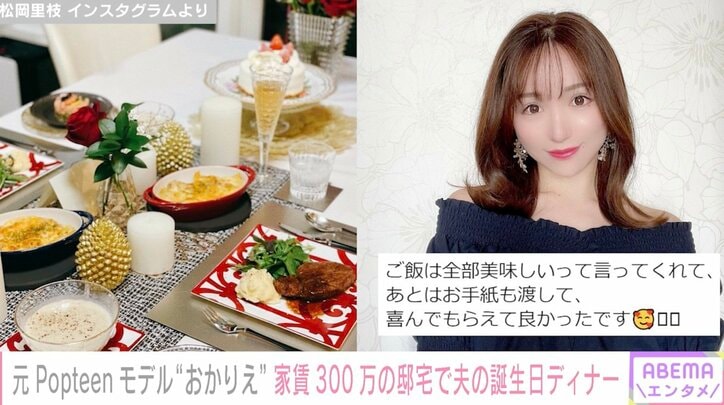 元Popteenモデル・おかりえ、家賃300万の邸宅で夫の誕生日ディナー「夜景が綺麗すぎ」「ホテルかと思ったらおうちだった」と羨望の声 ABEMAエンタメ 2023/01/27 15:38 拡大する 元『Popteen』モデルで現在はブランドディレクターとして活動する“おかりえ”こと松岡里枝が26日、Instagramを更新。夜景を一望できる自宅での豪華ディナーを紹介した。【映像】家賃300万円のおかりえの自宅(複数カット) 松岡は、2020年7月、一般男性と結婚。2022年11月には、第1子妊娠を報告していた。 YouTubeチャンネルで自宅の家賃がおよそ300万円だと明かしていた松岡。今回はその邸宅で、夫の誕生日を祝ったといい、「お花を買って、風船を買って、予約していたケーキを取りに行って、それから一緒にプレゼントを買いに行って、夜はディナー作り。フォアグラとシャトーブリアンのロッシーニ 海老とアボカドのセルクル仕立て きのこのポタージュ マカロニグラタンを作りました」と豪華料理の数々を投稿した。 続きを読む