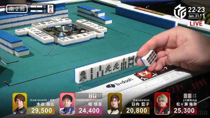 俺のアガリ牌はここだ!松ヶ瀬隆弥、手首の返しも強烈な迫力ツモが炸裂「パワー」「気合でツモる男」/麻雀・Mリーグ Mリーグ 2023/02/01 09:59 拡大する 繊細な読みと剛腕を併せ持つ男。EX風林火山の松ヶ瀬隆弥(RMU)が、その迫力満点のツモでファンを魅了した。プロ麻雀リーグ「大和証券Mリーグ2022-23」の第1試合、南2局でのことだった。起家からTEAM雷電・本田朋広(連盟)、KADOKAWAサクラナイツ・堀慎吾(協会)、渋谷ABEMAS・日向藍子(最高位戦)、松ヶ瀬の並びで開局した当試合、松ヶ瀬は東2局1本場で平和のみの1000点(+300点、供託1000点)、南1局で一盃口・赤の2600点を獲得。トップ目は東4局1本場でタンヤオ・赤・ドラの4000点(+300点、供託1000点)をアガった本田で、2着目の松ヶ瀬とはわずか4200点差だった。 続きを読む