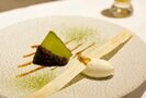 趣向をこらした様々なデザートメニューの中から、藤井王将の選択は「自家製あんこと京都一保堂の抹茶を使ったバスクチーズケーキ 立川産軟白うどのチップを添えて」と国産ラ・フランス(ジュース)だった。前日の午後のおやつに羽生九段もオーダーした一品で、こんがりとした焼き目が美しい抹茶風味のバスクチーズケーキだ。