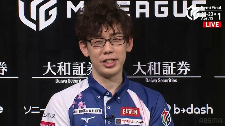 このトップは愛妻のために!渋川難波、結婚後初インタビューで耳まで真っ赤「頑張りました!」/麻雀・Mリーグ Mリーグ 2023/04/14 08:27 拡大する 勝って結婚報告、最高のセミファイナル初陣だ。プロ麻雀リーグ「朝日新聞Mリーグ2022-23」セミファイナルシリーズ、4月13日の第1試合はKADOKAWAサクラナイツ・渋川難波(協会)がトップ。僅差を制して喜びいっぱい、試合後のインタビューでは愛妻へ勝利のメッセージを伝えた。【映像】愛妻への勝利報告に渋川難波は耳が真っ赤に この試合は東家から渋谷ABEMAS・多井隆晴(RMU)、EX風林火山・松ヶ瀬隆弥(RMU)、TEAM雷電・瀬戸熊直樹(連盟)、渋川の並びで開始。東2局2本場、渋川は供託2000点の状況も手伝って、2つ仕掛けてテンパイ。白・赤の2000点(+600点、供託2000点)を手に入れた。 続きを読む