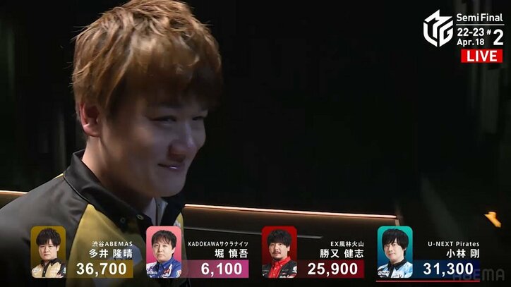控室まで我慢できない?“麻雀星人”多井隆晴、トップ直後にドヤ顔溢れる「不敵な笑み」「どやはる」/麻雀・Mリーグ Mリーグ 2023/04/19 07:37 拡大する これもMリーグを牽引し続けるエンターテイナーとしての振る舞いか。4月18日、プロ麻雀リーグ「朝日新聞Mリーグ2022-23」セミファイナルシリーズ6日目の第2試合では、渋谷ABEMASの多井隆晴(RMU)が、熟練の打ち回しで先行逃げ切りに成功。試合を終えて控室へと戻る際、カメラに向かってドヤ顔を決める一幕があった。【映像】うれしさが溢れる 多井隆晴、去り際のドヤ顔 起家から多井、KADOKAWAサクラナイツ・堀慎吾(協会)、EX風林火山・勝又健志(連盟)、U-NEXT Pirates・小林剛(麻将連合)の並びでスタートした当試合、多井はテンパイ流局で迎えた東1局1本場でリーチ・ツモ・平和・三色同順・ドラの親跳満・1万8000点をアガった。「大丈夫です。(点数が)高かったので。大丈夫です」。早々にリードを奪ったことで、その後は百戦錬磨の打ち回しで卓上をコントロール。アガリ1回、放銃ゼロで試合を終えると、会場は渋谷ABEMASのチームカラーである金色に染まった。 続きを読む