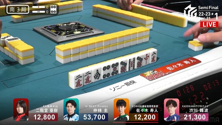 判断早すぎて中継カメラも必死!佐々木寿人、神速の「初手カン」にファンも「はやすぎw」/麻雀・Mリーグ Mリーグ 2023/04/25 09:08 拡大する 迷いのないプレーが“魔王”の持ち味。プロ麻雀リーグ「朝日新聞Mリーグ2022-23」セミファイナルシリーズ、4月21日の第1試合。KONAMI麻雀格闘倶楽部・佐々木寿人(連盟)が第1打の前に白をカン。あっという間の動きに中継カメラも必死に追い、視聴者からも驚きの声が上がった。【映像】佐々木寿人、迷わず「初手カン」の瞬間 南3局、親番の佐々木は配牌で白が4枚。ここで佐々木は素早くカン、リンシャンからツモを行った。あまりに素早い動きにカメラも急いでその様子を追い、視聴者も「初手カン!」「はやすぎw」「魔王がくるぞー!!」「ゼンツ宣言w」と一気に盛り上がった。 続きを読む