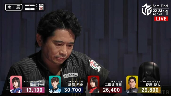 やべぇ、やらかした…萩原聖人、痛恨の役満・大三元逃した理由を「やだ!絶対話さない!」と爆笑リアクション/麻雀・Mリーグ Mリーグ 2023/04/29 07:00 拡大する 役満を逃した“やらかし”。スター雀士はそんなシーンも華がある。プロ麻雀リーグ「朝日新聞Mリーグ2022-23」セミファイナルシリーズ、4月28日の第1試合。役満・大三元を惜しくも逃した萩原が、試合後のインタビューでこの話題を「やだ!絶対話さない!」と断り、そのリアクションに視聴者から爆笑が起こった。【映像】萩原聖人、痛恨の役満逃しの瞬間 場面は南1局。9巡目の萩原の手には發と中が暗刻、白が1枚と、役満を狙うには絶好の手牌。しかし白を切ればカン5筒待ちの6400点、ツモれば満貫のテンパイだ。ここで萩原は長考の末、白を切ってテンパイ取りの決断とした。しかし次のツモはまさかの白。萩原は思わず「やべぇ、やらかした…」というリアクションを見せた。 続きを読む