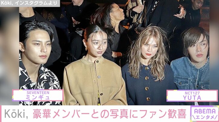 Koki, 、セブチ・ミンギュ&NCT127・YUTAらとの豪華ショットに歓喜の声「同じ画面上に収まっちゃっているのがすごい」 ABEMAエンタメKoki,Koki 2023/05/01 09:19 拡大する モデルのKoki,が投稿した豪華メンバーとの写真が話題になっている。【映像】Koki,とYUTAらの写真(複数カット) Koki,は、29日に韓国・ソウルで行われたルイ・ヴィトンのファッションショーの様子をInstagramに投稿。「ありがとうございました」とコメントし、韓国のボーイズグループ・SEVENTEENのミンギュや、NCT127のYUTAらと撮影した写真や動画を公開した。 YUTAもInstagramのストーリーズで、Koki,、歌手のAwichとの3ショットを投稿している。 続きを読む