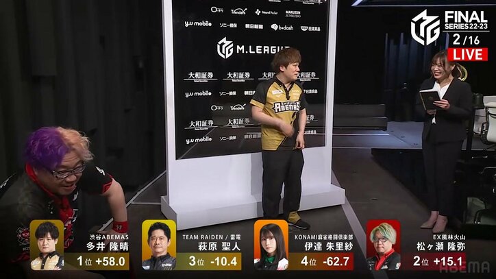 「え?違うの?」最強雀士、懸命に回避した親のダブルリーチが読み違いでびっくり仰天/麻雀・Mリーグ Mリーグ 2023/05/09 08:45 拡大する 最強雀士の心眼でも、ダブルリーチの待ちは読み切れず?プロ麻雀リーグ「朝日新聞Mリーグ2022-23」ファイナルシリーズ、5月8日の第2試合。ライバルの親がかけたダブルリーチを渋谷ABEMAS・多井隆晴(RMU)が読み切ったつもりがまさかの外れ。インタビューで真実を知ったとたんびっくり仰天する一幕があった。【映像】真実を知り仰天する多井隆晴 場面は東2局、親のTEAM雷電・萩原聖人(連盟)から5・8筒待ちのダブルリーチがかかった。多井は同じ待ちでこれに追いかけ、終盤に5筒をツモ、リーチ・ツモ・平和の2700点を加点した。このアガリにファンからは「神回避」と絶賛の声も上がった。 続きを読む