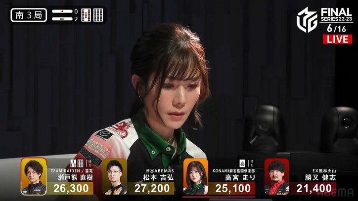 「天才かよw」「これはドラマティックすぎるw」高宮まり、放銃牌を5枚も止める連続ブロック発動の神プレー/麻雀・Mリーグ Mリーグ 2023/05/12 08:07 拡大する どんなピンチが訪れても、小さな体で全部受け止める。プロ麻雀リーグ「朝日新聞Mリーグ2022-23」ファイナルシリーズ、5月11日の第2試合。KONAMI麻雀格闘倶楽部・高宮まり(連盟)がライバルへの放銃牌を5枚も止める“連続ブロック”、その神プレーに視聴者から驚きの声や賛辞が寄せられた。【映像】高宮まりのスーパーブロック連発シーン 場面は南3局2本場、TEAM雷電・瀬戸熊直樹(連盟)が3・6索待ちのリーチ。これに対し親の高宮は3索と東のシャンポン待ち、アガれるのは東の後付けだけという形で応戦、めくり合いに持ち込んだ。15巡目、アガれないほうでなおかつ瀬戸熊への放銃となる3索をキャッチ。放送席は「これは東!」と絶叫。高宮は冷静に東を切り、あわよくばタンヤオ、流局に持ち込んでの連荘を狙う。視聴者からは「回収したw」「まりあんぬナイス!」「素晴らしい」と賛辞が続々。しかし凄いのはさらにここからだ。 続きを読む