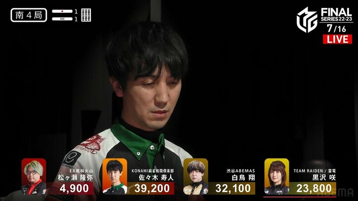 魔王の手がシャーレにまだ伸びる 佐々木寿人、逆転Vへなりふり構わず意地のトップ/麻雀・Mリーグ Mリーグ 2023/05/13 07:00 拡大する トップをもぎ取ると“魔王”はカメラの前で一足早く決めポーズを見せた。プロ麻雀リーグ「朝日新聞Mリーグ2022-23」ファイナルシリーズ、5月12日の第1試合はKONAMI麻雀格闘倶楽部・佐々木寿人(連盟)が僅差のオーラスを凌いで逃げ切りトップ。逆転Vへ頼れる男が存在感を発揮した。【映像】佐々木寿人はファンへ勝利報告 ファイナルの折り返し地点となるこの日、第1試合は東家からEX風林火山・松ヶ瀬隆弥(RMU)、佐々木、渋谷ABEMAS・白鳥翔(連盟)、TEAM雷電・黒沢咲(連盟)の並びで開始した。前節に渋谷ABEMASがデイリーダブル達成、この日は自身のトップ獲得と共に、首位にこれ以上走らせないことがテーマだ。佐々木は東1局、松ヶ瀬の親リーチをかわす1600点のアガリで好発進。うまくまとめた七対子の白待ちで、これはリーチの現物。派手さはないが効果的な得点に“魔王”のうまさが光った。 続きを読む