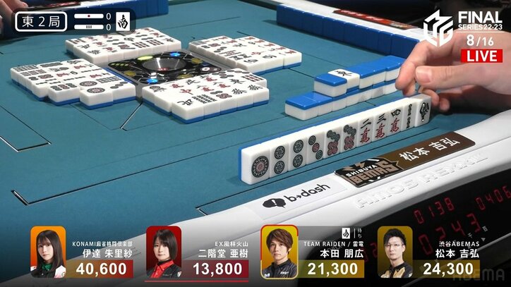 「マジ危ねぇ!」アガリ牌食い取った雀士、ホッとするどころかめちゃくちゃ絶望顔「おでこしわしわ」/麻雀・Mリーグ Mリーグ 2023/05/13 07:30 拡大する ファインプレーなのに、なぜかその表情は渋い。プロ麻雀リーグ「朝日新聞Mリーグ2022-23」ファイナルシリーズ、5月12日の第2試合。ライバルのリーチのハイテイツモを食い取った渋谷ABEMAS・松本吉弘(協会)が流局後に絶望の表情を見せて、視聴者から多くの反響が寄せられた。【映像】アガリ阻止にも松本吉弘はなんとも渋い顔 場面は東2局、TEAM雷電・本田朋広(連盟)がドラの南待ちでリーチ。終盤に松本はハイテイをずらすチー。これが大成功で、ハイテイの牌は南。ツモられていれば跳満、もしくは倍満の大惨事になっていたところだった。 続きを読む