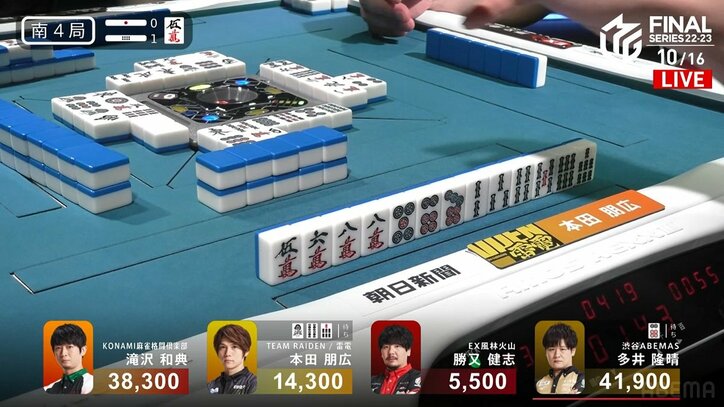 迷った時は前に進め!本田朋広の“魅せる麻雀”アガリ拒否フリテンリーチにファン熱狂「本田一発たのむ!」/麻雀・Mリーグ Mリーグ 2023/05/16 07:46 拡大する ロン牌を見逃し、ツモったからには高目を目指してフリテンリーチ。超短期決戦ならではの駆け引きだ。プロ麻雀リーグ「朝日新聞Mリーグ2022-23」ファイナルシリーズ、5月15日の第2試合。TEAM雷電・本田朋広(連盟)の“魅せる麻雀”が視聴者を魅了した。【映像】本田朋広、決死のフリテンリーチ 場面は南4局1本場。トップ目は目下トータル首位の渋谷ABEMAS・多井隆晴(RMU)。2着目にKONAMI麻雀格闘倶楽部・滝沢和典(連盟)が付け、本田は3着目。本田は2巡目にして三色同順が色濃く見えるタンヤオ・平和のイーシャンテン。ここで考えておかなければならないのは多井をトップにさせない決着だ。ダマテンでタンヤオ・平和・ドラの3900点を直撃すれば、多井と3600点差の滝沢がトップに入れ替わる。 続きを読む