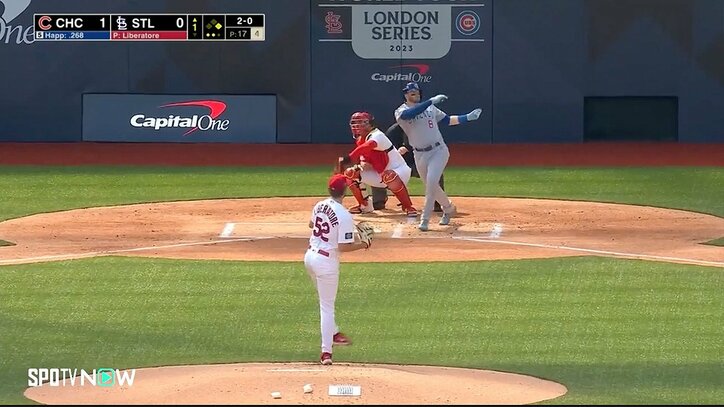 ファウルゾーンに飛んだのはボールじゃなくてバット!?鈴木誠也の同僚がまさかの珍プレー メジャーリーグベースボール 2023/06/26 07:30 拡大する 【MLB】カージナルス7─5カブス(6月25日・日本時間25日/ロンドン) 4年ぶりの開催となったロンドンシリーズは1回表からゲームが動いた。普段、野球を生で観戦することのないファンも大いに沸いた。だが、盛り上がったのは得点シーンだけではない。ハップのスイングしたバットが吹っ飛んでいった場面でも大きなどよめきが起こった。【映像】すっぽ抜けちゃった…どこまで飛んでいくバット? 1回表、カブスは1点を先制し、なおも2死一塁の場面。5番のハップはカウント2ボールからの3球目をフルスイング。リベラトーアが投じたシンカーはミットに収まった。が、ハップの手元からバットが三塁側のファールゾーンへ一直線。バットがすっぽ抜けるシーンを初めて目の当たりにした観客も多かったのだろう。スタンドは大きくどよめいた。 続きを読む