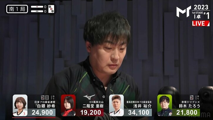 なぜ7筒で待っている?回避不能の“迷彩七対子”が倍満で炸裂 解説者「これはダメだ!」と絶叫/麻雀・Mトーナメント Mリーグ 2023/06/27 08:05 拡大する 意表を突く待ち取りが、ライバルからの一発ロンを呼び込んだ。Mリーガー、各プロ団体推薦者が出場する「Mトーナメント2023」予選1stステージのI卓が6月26日に行われ、第1試合では鈴木たろう(赤坂ドリブンズ・最高位戦)による回避不能の“迷彩七対子”による倍満が炸裂、放送席も騒然とした。【映像】狙いすました7筒待ちの七対子が倍満に 場面は南1局、たろうは2巡目に七対子のイーシャンテンとなった。ドラの3筒が対子で入った大物手だ。6巡目にドラが暗刻となるが、これはツモ切り。上家の浅井裕介(連盟)が1巡目に打8筒、対面の白銀紗希(連盟)の2巡目にも8筒があり、山にいそうと読んだ7筒をしつこく残す。10巡目、待望のテンパイを果たすと、ノータイムで7筒待ちのリーチ。解説の仲林圭(U-NEXT Pirates・協会)は「愛した7筒でいきますよ!」と大興奮。たろうの河はピンズがバラバラと切られており、とても7筒が当たるようには見えない。 続きを読む
