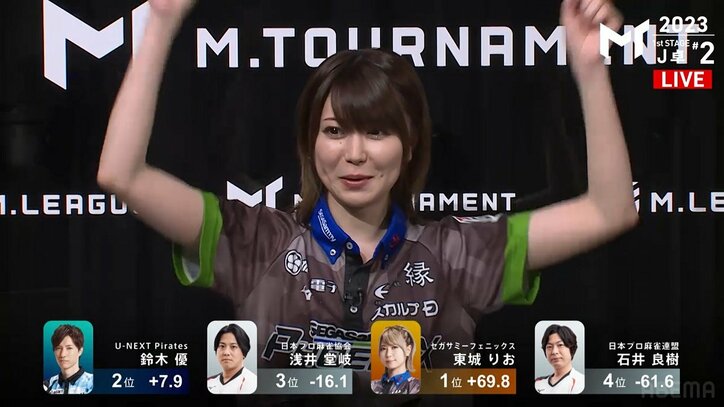 裏ドラ合計8枚に「脳が燃えました」東城りお、爆運炸裂で2位通過 目標は「近藤さんと決勝で!」/麻雀・Mトーナメント Mリーグ 2023/06/27 08:10 拡大する 勝ち進んだ末に夢の舞台がある。Mリーガー、各プロ団体推薦者が出場する「Mトーナメント2023」予選1stステージのJ卓が6月26日に行われ、東城りお(セガサミーフェニックス・連盟)が2位通過を決めた。試合後は本タイトル戦で選手としての活動を勇退することが決まっている近藤誠一(セガサミーフェニックス・最高位戦)と、この舞台で戦う目標を語った。【映像】豪運、炸裂!東城りお、裏ドラ3枚ゲットのシーン 第1試合は東家から東城、鈴木優(U-NEXT Pirates・最高位戦)、浅井堂岐(協会)、石井良樹(連盟)の並びで開始した。浅井堂岐が大きく抜け出す展開で、東城は3着。第2試合は早々に1万1000点持ちのラス目に落とされるも、東2局1本場、リーチ・平和・裏ドラ2の8000点(+300点)を鈴木優からアガって、息を吹き返した。東3局には5・8筒待ちのリーチ、石井からロンを決めると、なんと裏ドラは3枚。リーチ・裏ドラ3の1万2000点を獲得しトップ目に立つ。その後、鈴木優が4万100点とリードを広げ、これを追う南3局1本場、石井のリーチに東城は終盤に6・9筒で追っかけリーチ。山には6筒が1枚だけと厳しい形だったものの、これを一発でロン、リーチ・一発・平和・赤・裏ドラの1万2000点(+300点、供託2000点)をゲットし再逆転。同2本場も裏ドラ2枚の親満貫を石井からアガりダントツ。オーラスは石井の猛連荘をしのぎ、2位で通過を決めた。 続きを読む