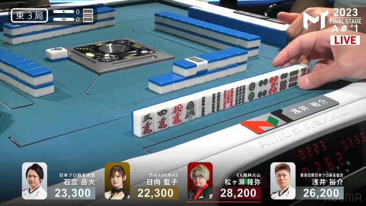 満貫なんかじゃ許さない!豪運雀士、赤3枚のデラックス配牌を最速跳満仕上げ 解説「眩しいなあ!」/麻雀・Mトーナメント Mリーグ 2023/07/16 07:08 拡大する 恵まれた素材を、卓越した腕が活かした傑作だ。Mリーガー、各プロ団体推薦者が出場する「Mトーナメント2023」ファイナルステージのA卓が7月15日に行われた。第1試合でトップを取った浅井裕介(最高位戦)は自分でも「ツキ過ぎでは!?」と驚くほどの豪運を披露。中でも東3局の跳満はその配牌、手順に視聴者から喝采が寄せられ、解説もその煌めく手に「眩しいなあ!」と驚くほどだった。【映像】輝かしい浅井裕介の赤牌3枚入り配牌 続きを読む