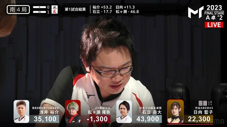 石立岳大は甘えない!一発消し&アガリ牌食い流しの鳴きが次々とライバル沈める好プレー「こんな事ある?ww」/麻雀・Mトーナメント Mリーグ 2023/07/16 07:11 拡大する やるべきことをやる、その姿勢が僥倖を呼び込んだ。Mリーガー、各プロ団体推薦者が出場する「Mトーナメント2023」ファイナルステージのA卓が7月15日に行われた。第2試合では石立岳大(連盟)が相手のリーチに対して一発消し、これがアガリ牌を食い流す好プレーに繋がり、2位通過へのルートを切り拓いた。【映像】多くの人の運命を変えた石立岳大のチー 場面は緊迫する南4局1本場。ラス親の日向藍子(渋谷ABEMAS・最高位戦)が6・9索待ちのリーチ。なんとこれが5枚山に残っている。これを受けた石立は、上家から打たれた3筒を一発消しのチー。解説の竹内元太(最高位戦)は「仕事キッチリしてんなー!」。石立はこの日、松ヶ瀬隆弥(EX風林火山・RMU)の攻めに対しても自らのチーでアガリ牌を食い流しており、これを思い出した竹内は「怖いなあ、次のツモ…」。すると食い流れた牌は日向の一発ツモとなるはずだった6索だ。実況の古橋崇志(連盟)は「うわああ!こんなもんあるかよー!」と金切り声。竹内は「わっはっは!」と大笑い。 続きを読む