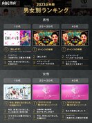 続く2位には、今春、空前の世界的ブームを巻き起こした『週刊ヤングジャンプ』(集英社)にて連載中の、原作:赤坂アカ、作画:横槍メンゴによる同名漫画を原作としたアニメ作品『【推しの子】』がランクイン。さらに、お笑いコンビ・千鳥がMCを務め、2022年の総合ランキングでも2位を記録するなどお笑いファンを中心に根強い人気を集めている『チャンスの時間』が3位に連なったほか、『テレビアニメ「鬼滅の刃」刀鍛治の里編』やオリジナル恋愛番組『オオカミには騙されない』シリーズ、夜帯のニュース番組『ABEMA Prime』など多彩なジャンルのコンテンツを取りそろえるABEMAらしさを体現した作品群がトップ10に並んだ。