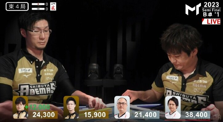 チャンピオンチームのガチバトル 多井隆晴、後輩からもぎ取った跳満直撃に痺れるファン「多井さん!きた!」/麻雀・Mトーナメント Mリーグ 2023/07/31 08:00 拡大する いつもは心強い仲間が、この日は倒すべきライバルに。Mリーガー、各プロ団体推薦者が出場する「Mトーナメント2023」ファイナルステージのB卓が7月30日に行われ、昨期チャンピオンとなった渋谷ABEMAS・多井隆晴(RMU)と松本吉弘(協会)が激突。Mリーグでは決して観られない、チームメイト同士の白熱勝負にファンは湧いた。【映像】多井隆晴VS松本吉弘 チームメイト同士の戦い 第1試合の東4局、多井はわずか2巡目にテンパイ。ドラ一万が対子の1・4・7索待ち、1索ならば一気通貫だ。トップ目は石立岳大(連盟)、続いて坂本大志(最高位戦)。ラス目にチームメイトの松本がいる。受け気味に進めていた松本、ドラが対子となり高目の1索を手の内から切り放銃。リーチ・平和・一気通貫・赤・ドラ2の1万2000点となった。開かれた手を見て松本はゲンナリ。実況の日吉辰哉(連盟)も「これはめっちゃきついよ、うわあ、顔が歪んだ!」とリアクションに着目した。 続きを読む