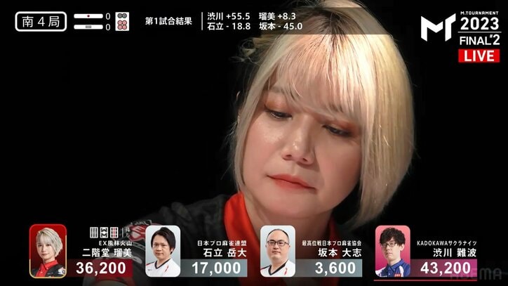 奇跡を信じて打った最後の勝負!二階堂瑠美、大逆転へのリーチに大興奮のファン「あがるで!」「瑠美頼む!」/麻雀・Mトーナメント Mリーグ 2023/08/07 07:00 拡大する 負けてなお強し、天衣無縫の麻雀はファンを盛り上げた。Mリーガー、各プロ団体推薦者が出場する「Mトーナメント2023」ファイナルが8月6日に行われ、逆転優勝を目指す二階堂瑠美(EX風林火山・連盟)のリーチにファンは大興奮。優勝を果たした渋川難波(KADOKAWAサクラナイツ・協会)と最後まで激戦を繰り広げた。【映像】大逆転優勝をかけた渾身のリーチ! 場面はオーラス、瑠美の優勝条件は跳満をツモること。瑠美は7巡目にテンパイ、待ちは6・9・8索の3面張と絶好。6・9索をツモるとリーチ・ツモ・平和・赤・ドラで5ハン、裏ドラか一発、もしくはハイテイが付けば6ハンの跳満、逆転だ。じっくり時間をかけ、瑠美は「リーチ!」と大きな声で発声、勢い良く牌を横にした。実況の日吉辰哉(連盟)は「一発でツモったら逆転ですよ!」。解説の土田浩翔(最高位戦)も「もう裏にかけてもいいね!」とこの勝負の行く末を見守る。ファンは「瑠美さん逆転のリーチ!」「あがるで!」「これ逆転ならすごいよ」「瑠美頼む!」と手に汗を握り応援だ。 続きを読む
