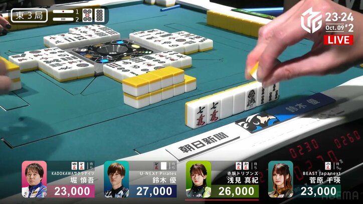 指先にツルッと気持ちいい感触 プロ雀士もつい声が出た“盲牌ツモ”にファンも共感「見せる前に宣言w」/麻雀・Mリーグ Mリーグ 2023/10/10 10:00 拡大する その感触を思い出すだけで、麻雀好きにはもうたまらない。プロ麻雀リーグ「大和証券Mリーグ2023-24」10月9日の第2試合。U-NEXT Pirates・鈴木優(最高位戦)が白を盲牌でツモってアガった場面、ファンも共感のコメントを連投した。【映像】鈴木優が指先で感じたアガリ牌 場面は東3局2本場、鈴木優は8筒と7索をチーして白の後付けというテンパイ。これを終盤にツモり、白・ドラの2000点(+600点、供託1000点)を手に入れた。この時鈴木優は盲牌でファンへツモ牌を見せる前に「ツモ」と発声。この速度にファンは「ツモ言うのはやw」「見せる前に宣言w」「ツルッツル」「触った瞬間ツモいうとるやんw」と驚きの声を寄せた。 続きを読む