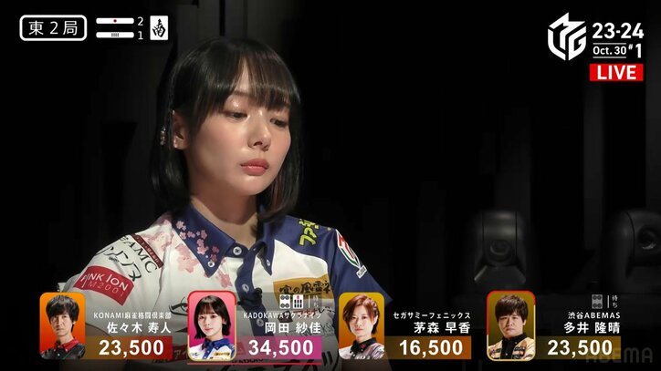 “かわいい”に凄みが同居した モデル雀士が投げつけた鋭い視線に放送席まで大注目「あんな目で見られたら惚れちゃう」/麻雀・Mリーグ Mリーグ 2023/10/31 11:30 拡大する ライバルをジロッとひとにらみ。プロ麻雀リーグ「大和証券Mリーグ2023-24」10月30日の第1試合。KADOKAWAサクラナイツ・岡田紗佳(連盟)が渋谷ABEMAS・多井隆晴(RMU)の追っかけリーチを受けた際のリアクションに放送席も大注目した。【映像】鋭い視線を飛ばす岡田紗佳 東2局1本場、親の岡田は早い巡目を活かして4筒と7索のシャンポン待ちでリーチ。これに対して向かってきたのが多井だ。待ちはカン4筒。岡田はこの瞬間、多井をジロッとにらみ、実況の日吉辰哉(連盟)は「岡田が今、多井をジッと見つめましたね!『アンタ、早く切りなさいよ』みたいな顔してましたよ!」と急遽アテレコ。 続きを読む
